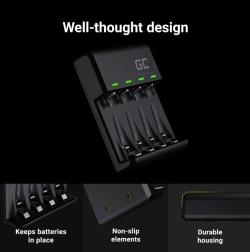 Pametna mehanika trdno drži baterije na mestu ter olajša vstavljanje in odstranjevanje. Odporno ABS ohišje s protizdrsom in napredni varnostni tokokrogi (toplotna, prenapetostna in kratkostična zaščita) varujejo vas in vaše akumulatorje ter zagotavljajo dolgo življenjsko dobo.
