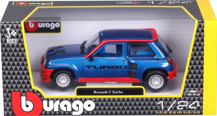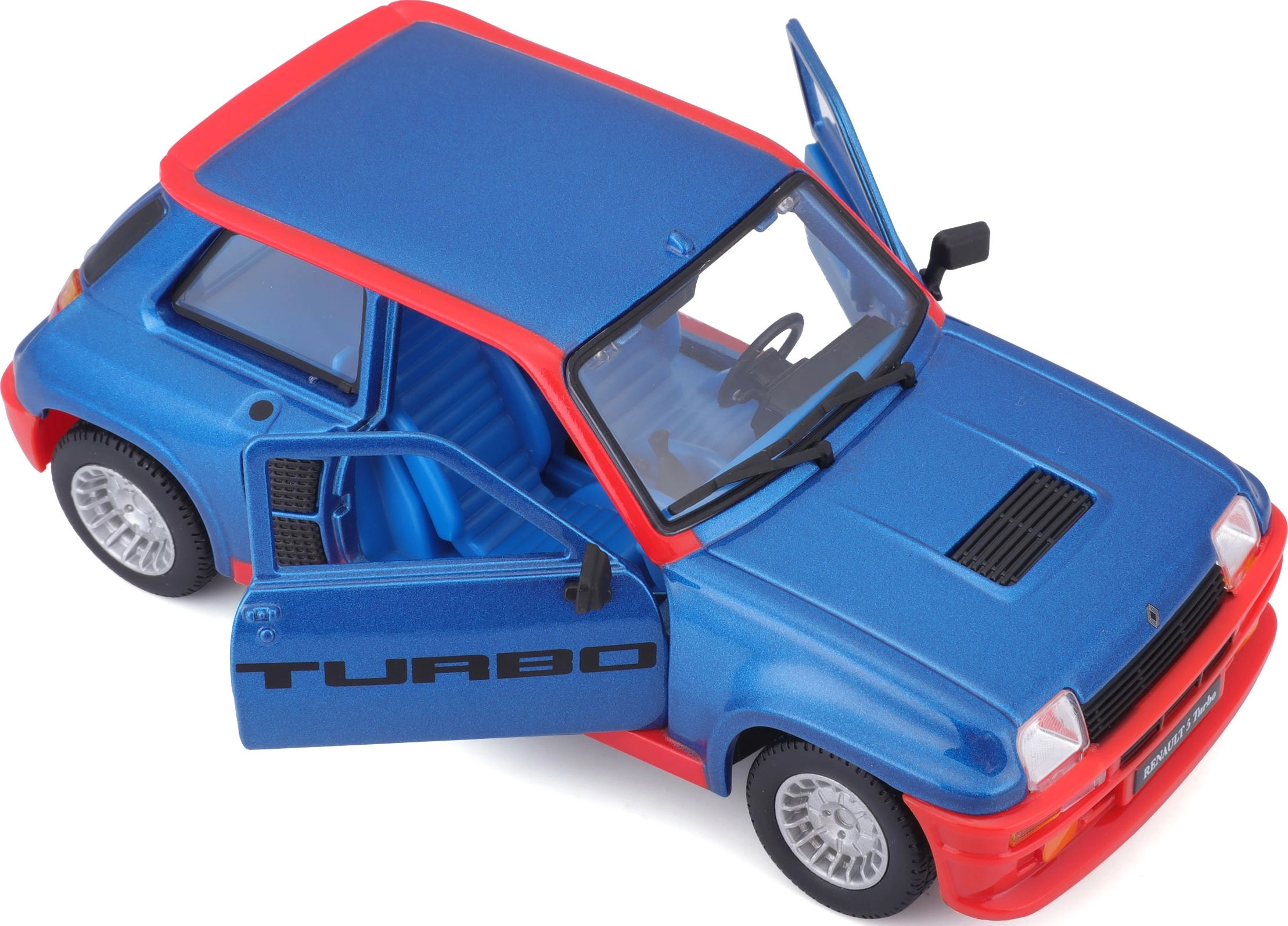 Model Bburago Renault 5 Turbo prinaša zvesto repliko legendarnega vozila z ikoničnimi širokimi blatniki in športnimi elementi. V modri barvi z rdečimi poudarki ter izrazitim napisom TURBO deluje kot pravi dirkalni special. Odpirajoča se vrata razkrijejo realističen interier s sedeži in volanom.