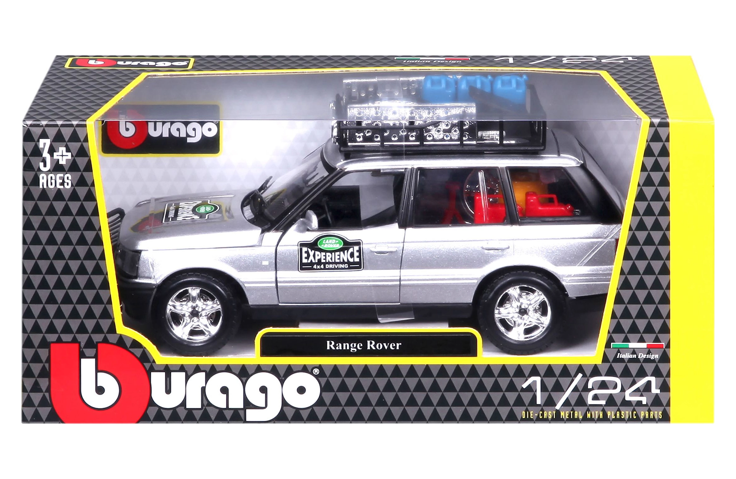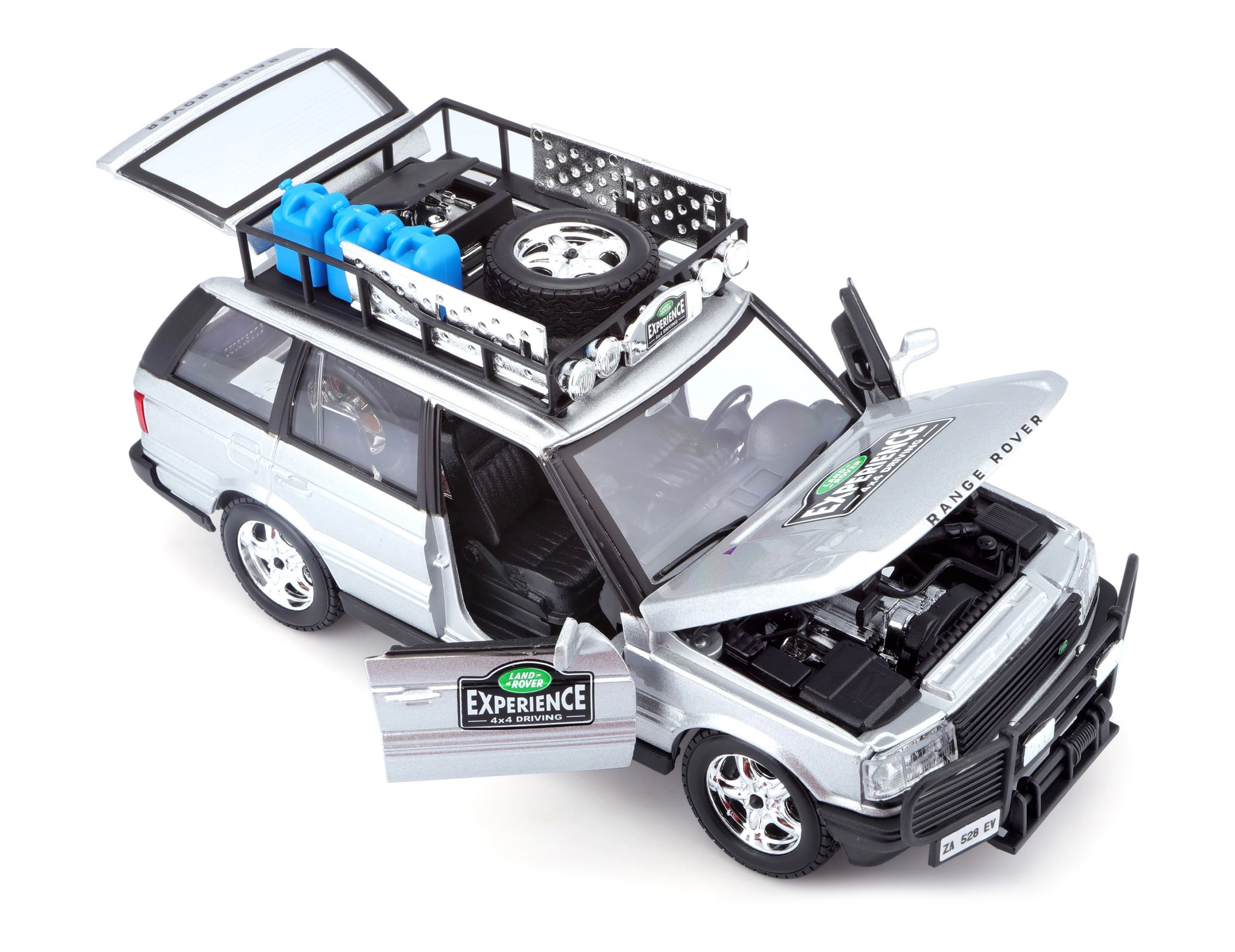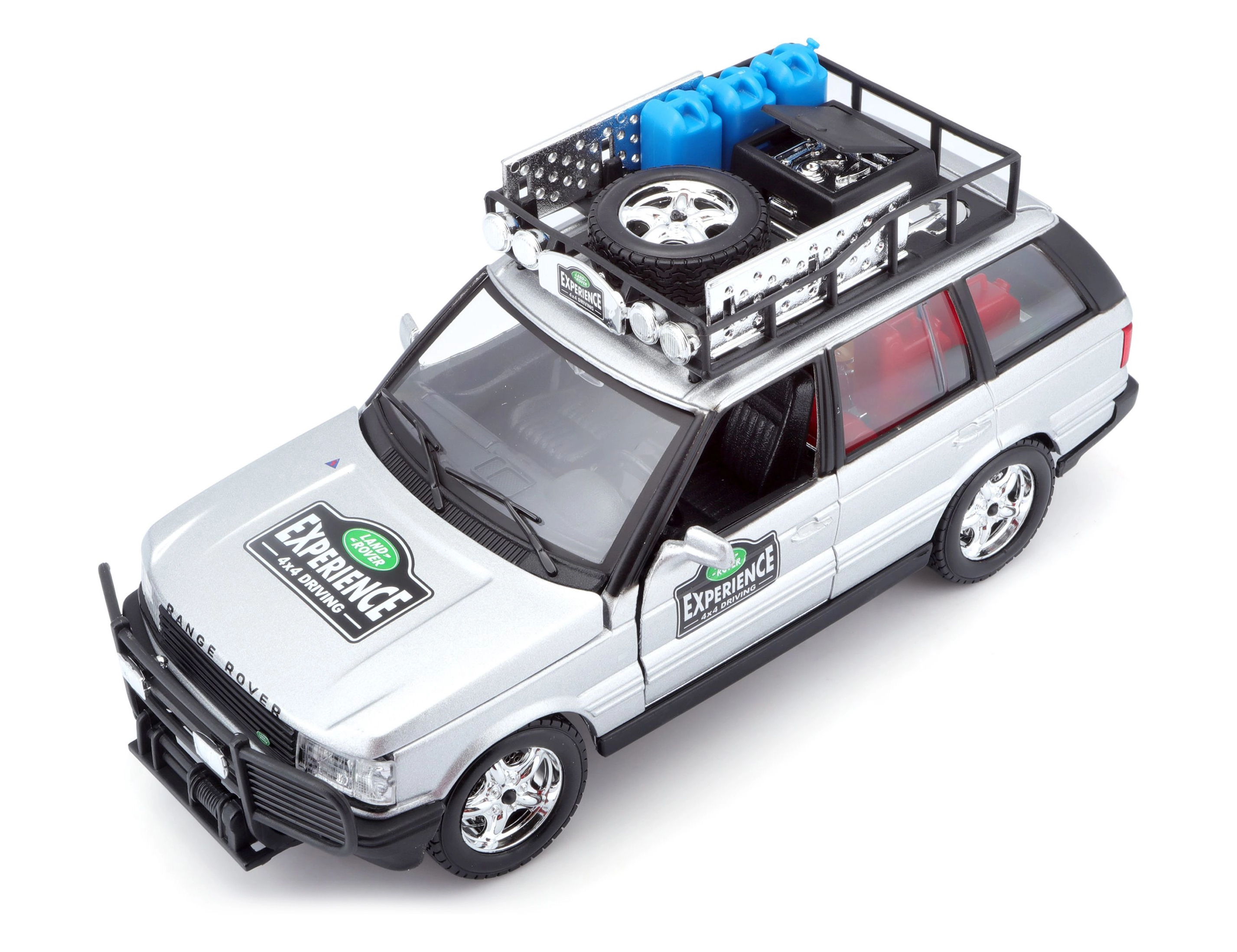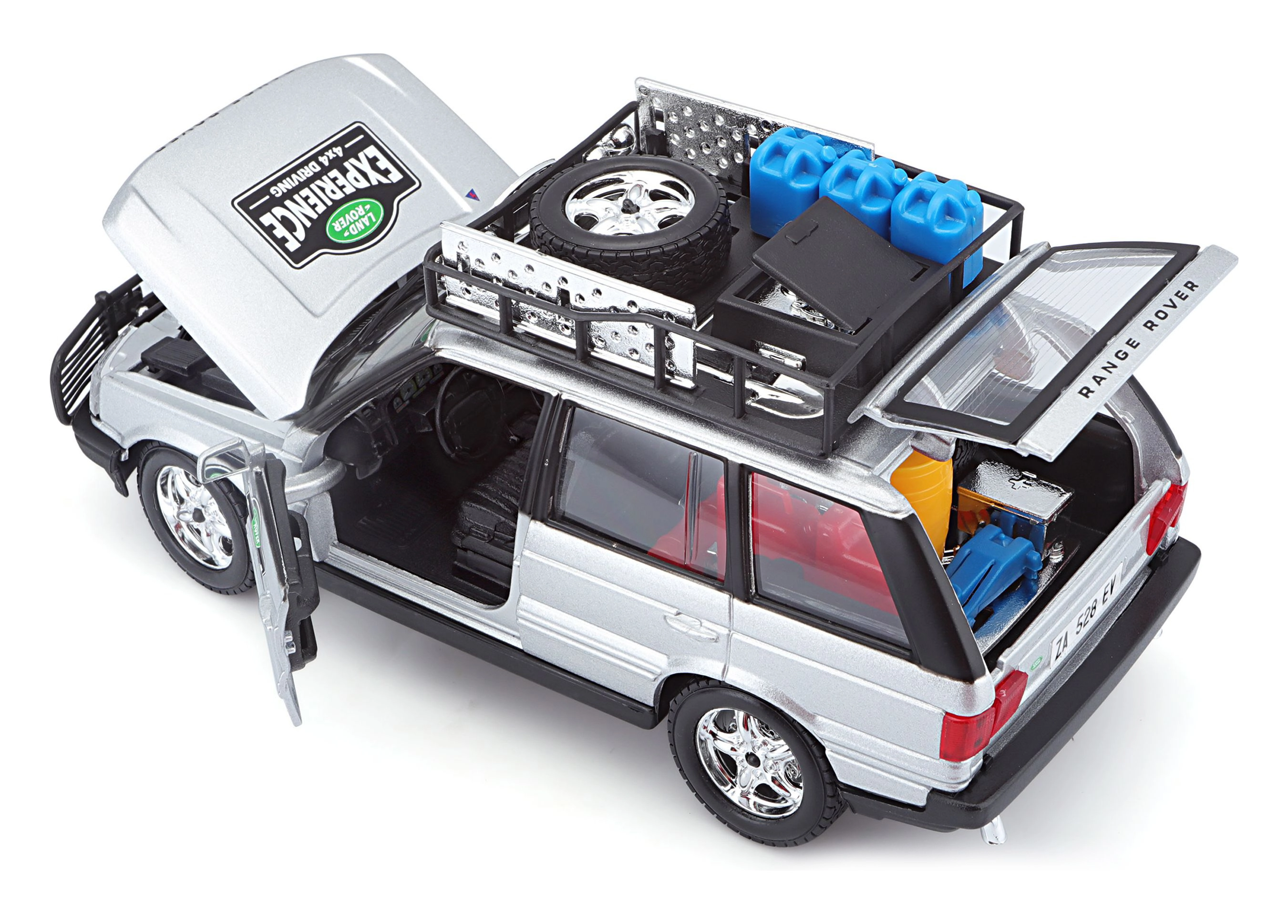Ta natančno izdelan model vozila RANGE ROVER v merilu 1:24 prinaša avtentične podrobnosti, ki bodo navdušile vsakega ljubitelja terenskih vozil. Srebrna karoserija, dopolnjena s strešnim prtljažnikom s pripadajočo opremo, sprednjim zaščitnim okvirjem in realističnimi poslikavami, ustvarja privlačen videz za igro in razstavljanje.