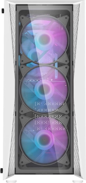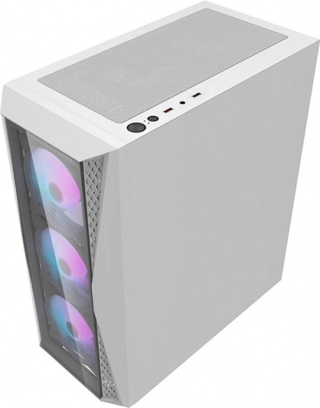 Bočnica in sprednja plošča iz kaljenega stekla poudarita komponente in ARGB učinke. Elegantno belo ohišje se odlično poda tako igralnim kot pisarniškim sestavam.