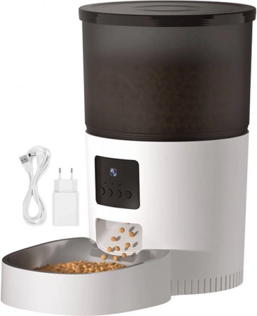 Pametni podajalnik Rojeco s 3‑l zalogovnikom, vgrajeno kamero 720p in povezavo Wi‑Fi vam omogoča, da imate hranjenje ljubljenčka pod nadzorom od kjerkoli. V aplikaciji preprosto nastavite načrt do 8 obrokov na dan, vsak po 1–20 porcij. Zahvaljujoč dvosmernemu zvoku in možnosti posneti do 10 s glasovnega sporočila lahko ljubljenčka na daljavo spodbudite k hranjenju. Podajalnik podpira dvojno napajanje (adapter 5 V / 3× baterije D) in ponuja zanesljivo delovanje tudi ob izpadu elektrike. Prozoren zalogovnik olajša nadzor nad hrano, preprosto vzdrževanje pa zagotavlja higieno pri vsakem hranjenju.