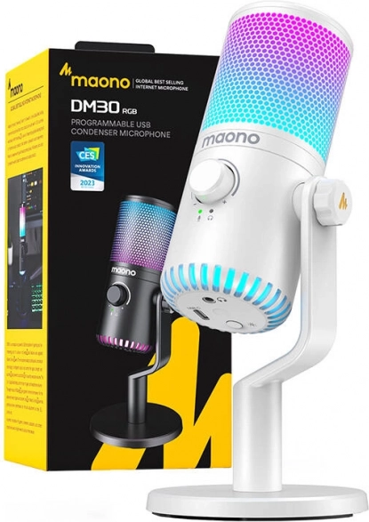 MAONO DM30 RGB je kompaktni namizni mikrofon, ki združuje profesionalno kakovost snemanja z atraktivnim dizajnom. Ponuja 7 barv in 5 RGB prehodov, zato se popolno zlije z vašo igralno postavitvijo, z kardioidnim zajemom pa zanesljivo zatre okoliški hrup in poudari vaš glas.
