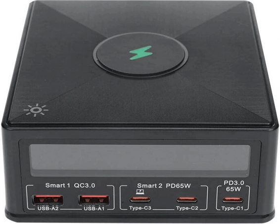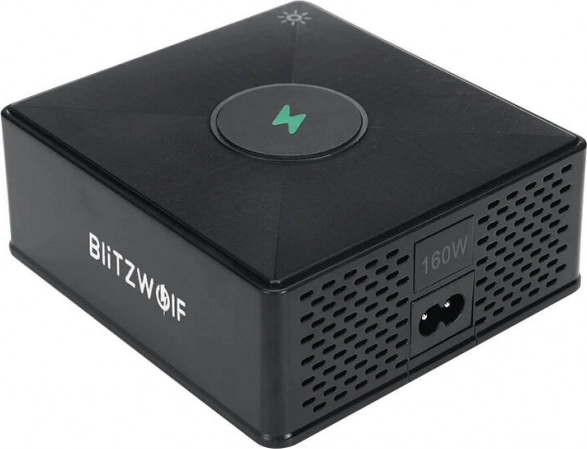 Zmogljiva polnilna postaja BLITZWOLF 160 W združuje 3× USB‑C, 2× USB‑A in 15 W brezžično polnjenje za sočasno napajanje telefona, tablice in prenosnika. Podpira PD in QC 3.0, ima inteligentno prepoznavanje naprav, LCD zaslon za pregled nad polnjenjem in varno zasnovo iz trpežnega PC+ABS.