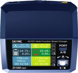 SKYRC D100neo združuje visoko zmogljivost in kompaktne mere. Vsak kanal zmore tok do 10 A, pri napajanju z enosmernim virom pa polnilec zagotovi do 200 W (2 × 100 W). Pri napajanju z izmeničnim tokom inteligentno razdeli do 100 W med oba porta. Natančno uravnoteženje ±0,02 V zagotavlja enakomerno napolnjenost celic in daljšo življenjsko dobo baterij.