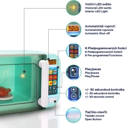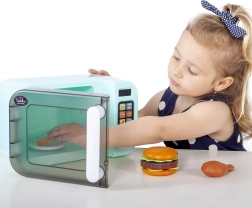 Okraskajte kuhinjico svojega malega kuharja z luksuzno otroško mikrovalovno pečico z zaslonom na dotik. Ta interaktivna mikrovalovka oddaja zvoke kot prava in sveti. Programiranje vključuje vrtenje krožnika s posnetkom jedi v notranjosti mikrovalovne pečice.
