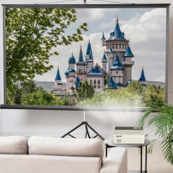 Ustvarite domače kino z lahkim in priročnim projektorjem, ki projicira do 100" sliko v razmerju 16:9. Ročno ostrenje in priloženo stojalo pomagata hitro prilagoditi idealno velikost in kot. Zahvaljujoč podpori Full HD signala 1920 × 1080 px dobite čisto sliko, polno podrobnosti.