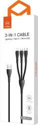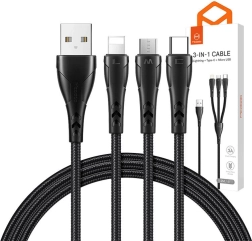 En kabel, trije konektorji – z USB‑C, Lightning in Micro USB pokrijete večino sodobnih naprav: pametne telefone, tablice, brezžične slušalke ali powerbanke. Kabel lahko napaja do tri naprave hkrati, zato prihranite prostor in čas.