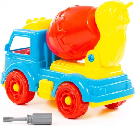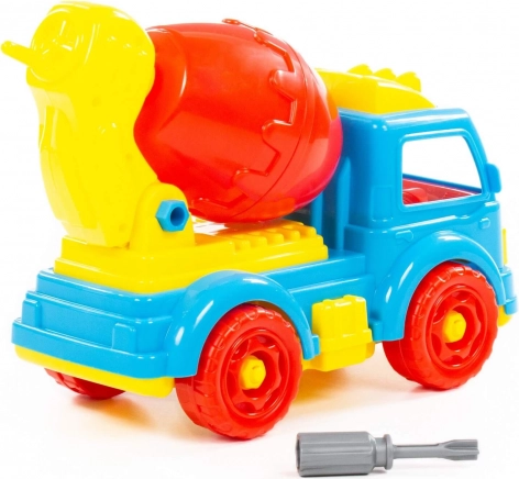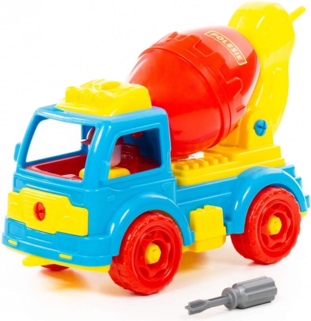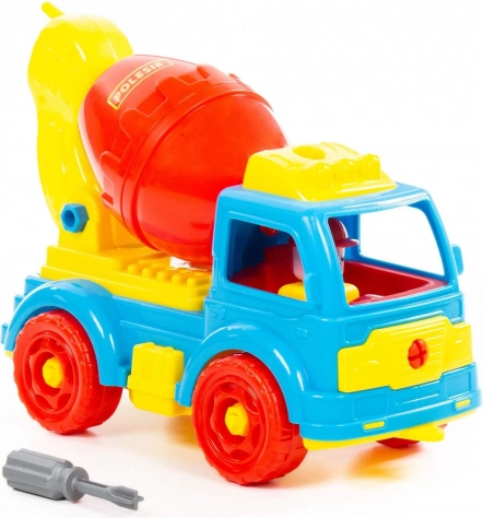 Zabaven plastičen mešalnik za male graditelje razvija fino motoriko, logično mišljenje in kreativnost. Otroci lahko vozilo sami razstavljajo in sestavljajo s pomočjo izvijača, vrtijo funkcionalno mešalno posodo in se igrajo s priloženo figurico gradbenika.