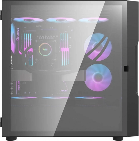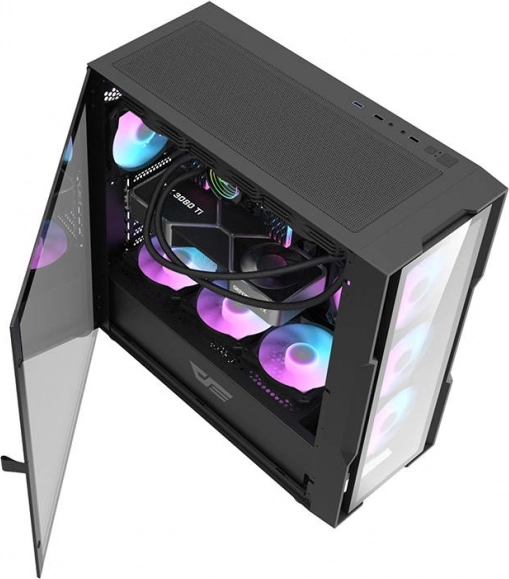Računalniško ohišje Darkflash DK431 Glass vam omogoča ustvariti privlačno in funkcionalno računalniško konfiguracijo. Odprte plošče, vključno s stranskimi iz kaljenega stekla, razkrivajo notranje komponente, medtem ko vgrajeni RGB ventilatorji zagotavljajo optimalno hlajenje.
