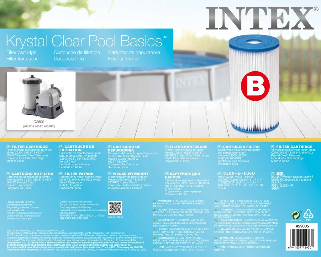 Primerno za vse kartušne filtre INTEX s filtrirno kartušo tipa B. Čisti vse nečistoče iz vaše bazenske vode. Gre za zelo fin filter za kristalno čisto vodo v bazenu. Menjavo kartuše priporočamo po 2–4 tednih uporabe. Preprosto vzdrževanje z izpiranjem z vodnim curkom.