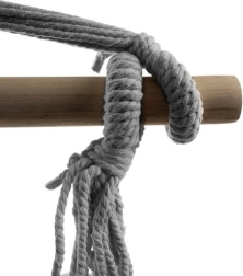 Lesena razpiralna palica enakomerno porazdeli obremenitev, zato je stol dobro uravnotežen in stabilen. Močna viseča vrv z montažnim obročem omogoča enostavno obešanje in varno uporabo. Del paketa sta 2 blazini 40 × 40 cm, ki povečata udobje pri sedenju.