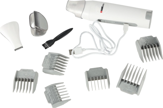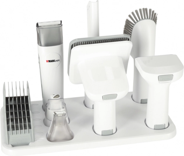 Brezžični prirezovalnik WMARK Pet s 6 glavničnimi nastavki (3–23 mm), krtačami, prirezovalnikom tačk in pilico za kremplje – vse v enem setu.