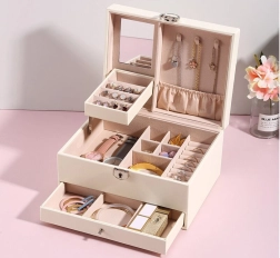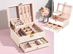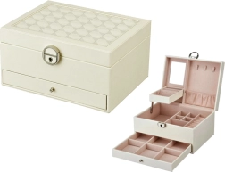 Ta stilska škatla za nakit v bež izvedbi je zasnovana za maksimalen pregled in zaščito vaših dragocenosti. Notranjost je obložena z mehkim žametom, ki preprečuje praskanje, pokrov pa dopolnjuje praktično ogledalo za hitre popravke. Zahvaljujoč pametni razporeditvi zlahka shranite različne tipe nakita in ure.