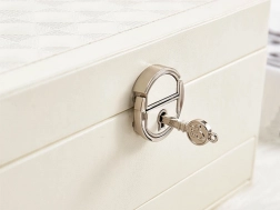 Bež eko usnje z nežnim reliefom, mehko žametno oblazinjenje in zaklepanje na ključ varujejo nakit in zasebnost.