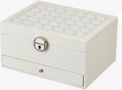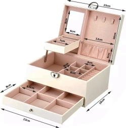 Zgornji del ponuja oddelke za prstane, uhane in ure, medtem ko je izvlečni predal s šestimi sekcijami popoln za zapestnice in druge dodatke. Ne manjkajo kljukice za verižice in žep z elastiko za drobnarije. Celotno ohišje je zaklenljivo s ključem, zato bo vaš nakit vedno na varnem.