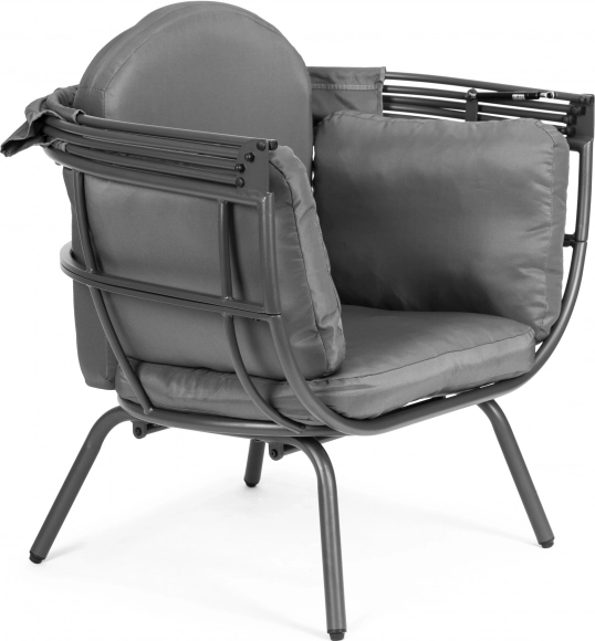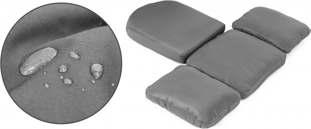 Za maksimalno udobje so priložene štiri blazine. Te blazine so ne le udobne, temveč tudi odporne na vse vremenske razmere. Material je enostaven za vzdrževanje in hitro sušeč, opremljen z zadrgo za preprosto snemanje prevlek za pranje.