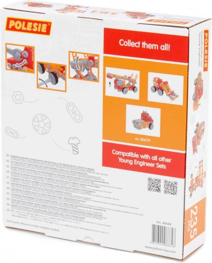 Konstruktor Mali inženir 235 delov proizvajalca Polesie je bil ustvarjen posebej za male inženirje. Deli so izdelani v obliki močnih trakov z odprtinami. Trakovi se med seboj povezujejo z vijaki in maticami. Komplet vsebuje podrobna navodila, po katerih lahko sestavite modele, prikazane na embalaži igrače. Igra s konstruktorjem ni omejena le na sestavljanje po navodilih. Mali inženirji lahko dajo prosto pot svoji domišljiji in ustvarijo nekaj novega ter odkrijejo svoj ustvarjalni potencial. Posamezne vrste konstruktorjev se tematsko razlikujejo, vendar so popolnoma združljive. Otroci si tako lahko ustvarijo celotno zbirko sestav!