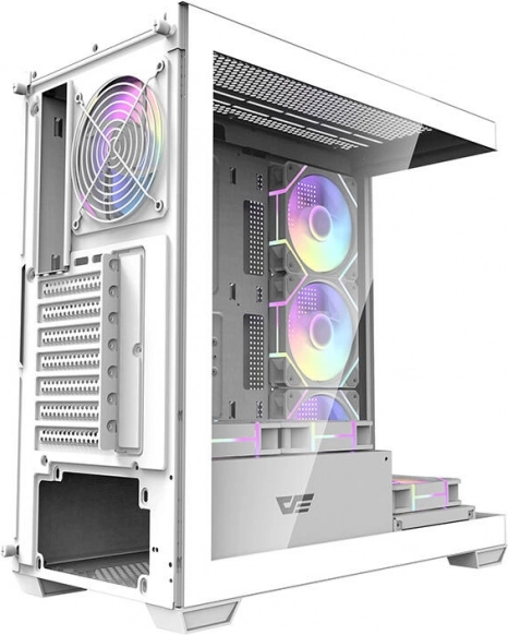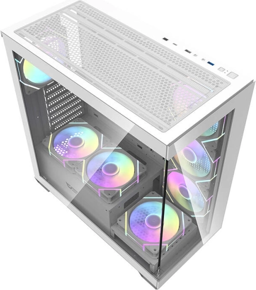 Elegantno in prostorno računalniško ohišje Darkflash DS900 v beli barvi ponuja panoramski dizajn brez A‑stebrička, dve stranski plošči iz kaljenega stekla in že vgrajenih 7 ARGB 120 mm ventilatorjev. Ponuja odličen pretok zraka, podporo velikim 360‑mm hladilnikom, združljivost z osnovnimi ploščami ATX/M‑ATX/ITX ter enostavno razširitev zahvaljujoč 7 PCI reži in premišljeni notranji postavitvi.