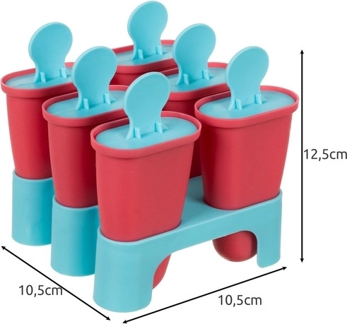 Premišljena zasnova ponuja 6 cilindričnih modelov za enakomerno zamrzovanje. Pokrovček deluje kot paličica z udobnim okroglim oprijemom in tremi odprtinami za čvrsto povezavo z zamrznjeno mešanico, zato sladoled po odstranitvi iz modela ne zdrsne. Stabilna osnova drži modele popolnoma navpično pri polnjenju in zamrzovanju, kar zmanjšuje nered.