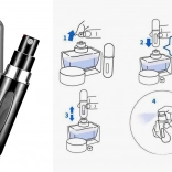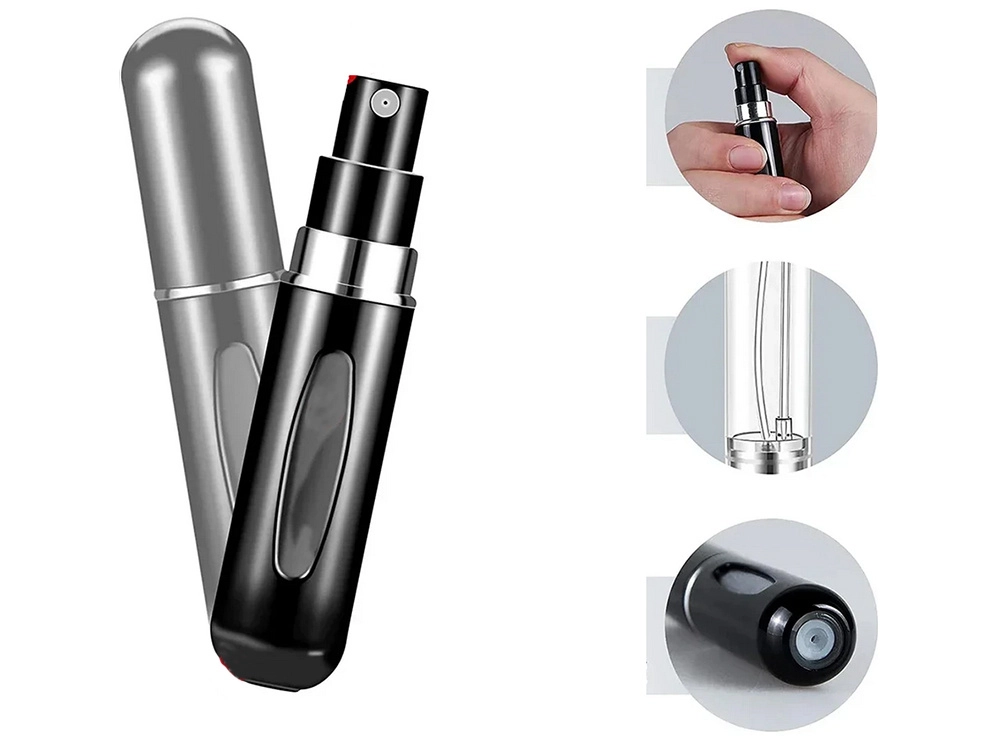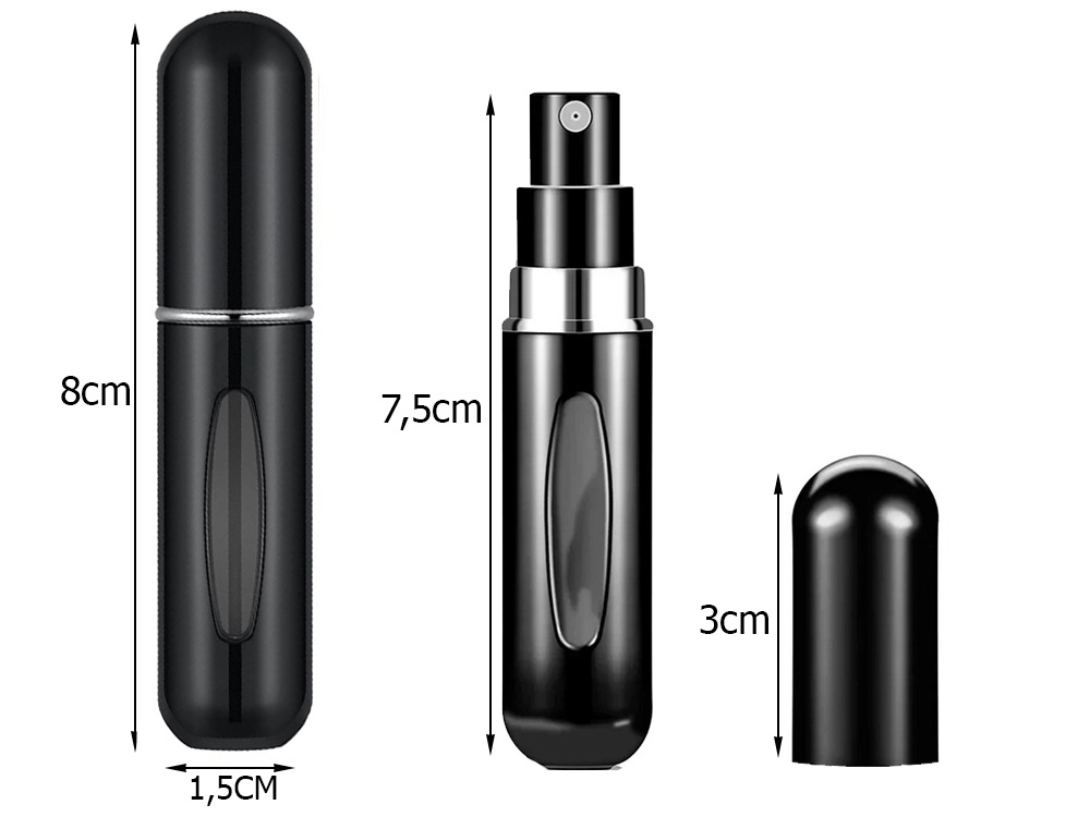 Polnjenje je hitro in čisto: preprosto odstranite glavo izvirnega parfuma in nataknite atomizer na cevko z mehanskim razpršilnikom. Z večkratnim pritiskom se steklenička hitro napolni. Zaradi kompaktnih dimenzij 8 × 1,5 cm se prilega v žep, torbico ali ročno prtljago.