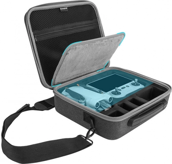 Torba vsebuje posamezne predelke za dron, upravljalnik in opremo, kar zagotavlja njihovo varno shranjevanje.