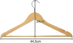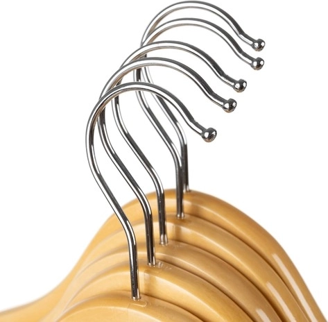 Premišljena ergonomska oblika pomaga ohraniti naravno linijo oblačila in zmanjšuje mečkanje. Vrezani utori na koncih obešala preprečujejo zdrs oblek ali topov z obešala. Vrtljiv kovinski kavelj olajša rokovanje, okrogla lesena palica pa je idealna za hlače, šale ali kravate – na en obešalnik lahko udobno obesite več oblačil.