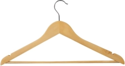 Rahlo ukrivljena oblika podpira ramenski del oblačil in preprečuje deformacije. Vrezani utori na koncih obešala preprečujejo zdrs oblek ali topov z obešala.
