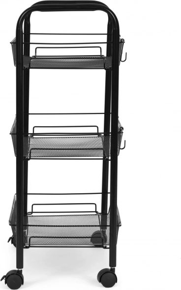 Univerzalen premični regal ModernHome s 3 košarastimi policami in trdno kovinsko konstrukcijo olajša organizacijo v kopalnici, kuhinji in pisarni. Zahvaljujoč 4 kolescem (2 z zavoro) ga zlahka prestavite, 4 kljukice pa ponudijo prostor za brisače ali pripomočke. Eleganten črn dizajn prihrani prostor in doda interierju moderen videz.