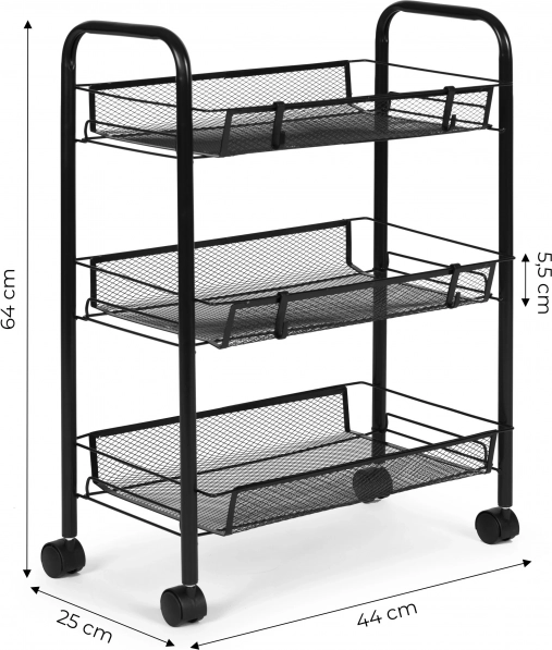 Praktičen in stilski pomočnik za vsak dom. Ozke mere regala omogočajo izkoristek tudi manj dostopnih mest, medtem ko tri prostorne košaraste police sprejmejo kozmetiko, čistila, začimbe, posodo ali pisarniške potrebščine. Vzdržljiva kovina zagotavlja stabilnost in dolgo življenjsko dobo.