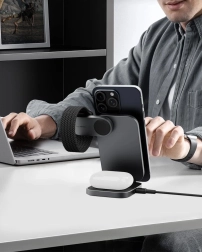 Uživajte v dvakrat hitrejšem brezžičnem polnjenju kot pri običajnih 7,5 W podlogah. MagFusion zagotovi do 15 W za združljive iPhone in hkrati napolni Apple Watch ter AirPods.