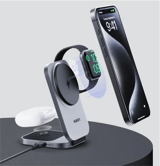 Uživajte v hitrem in varnem brezžičnem polnjenju celotne vaše Apple opreme v eni kompaktni postaji. AUKEY MagFusion uporablja Qi2 z močjo do 15 W za iPhone in hkrati polni Apple Watch ter polnilno ohišje slušalk AirPods. Stabilna magnetna pritrditev in nastavljiv kot jo naredita idealno stojalo za video klice in gledanje vsebin.