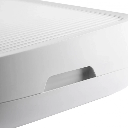 Gladek plastiko je enostavno čistiti – preprosto stresete ujeti pesek in splaknete. Minimalistična bela zasnova se odlično poda interierju.