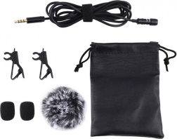 V kompletu sta dva sponka za pripenjanje na oblačila, kožuhast vetrobran za zunanjo rabo, dva penasta pop-filtra in praktično etui. Idealno za YouTube, TikTok, Amazon Live, podkaste, intervjuje in spletno poučevanje.
