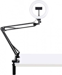 Robustna kovinska roka z dvojnimi vzmetmi trdno drži svetilo in telefon na mestu, medtem ko vijačna objemka varno pritrdi stojalo na mizo različnih debelin. Praktično USB napajanje iz prenosnika, računalnika ali polnilnika ter lahka, prenosna zasnova naredijo ta komplet idealno izbiro za vloganje, ličenje, produktno fotografijo in spletne sestanke.