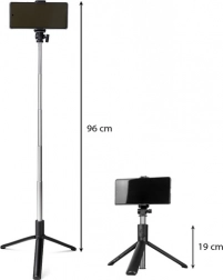 Ko jo razpnete v tripod, dobite stabilno osnovo za dolge ekspozicije, time-lapse ali videoklice. Odstranljiv daljinski upravljalnik deluje kot sprožilec fotoaparata in start/stop za video ter doseže do 10–15 m. Zahvaljujoč teleskopski zasnovi do 92 cm ujamete širši kader brez kompromisov, po zložitvi pa je palica dolga le 21,5 cm – popolna za na pot.