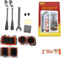 Vsebuje žlice za demontažo pnevmatik, ključ za kolesa in druga pomembna orodja, ki olajšajo popravila na poti.