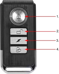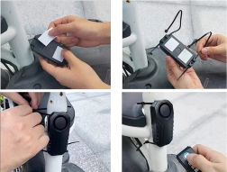 Paket vključuje daljinsko upravljanje za udobno aktivacijo in deaktivacijo alarma. Zaradi kompaktne zasnove in enostavne namestitve se alarm hitro pritrdi na okvir kolesa ali na skrito mesto na motornem kolesu.