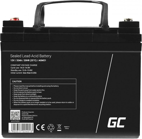 Brezvzdrževalni AGM akumulator Green Cell 12V 33Ah je zanesljiv vir napajanja za kosilnice, skuterje, čolne in invalidske vozičke. Primeren je za plavajoče in ciklično delovanje zahvaljujoč sodobni AGM tehnologiji.