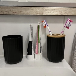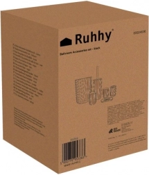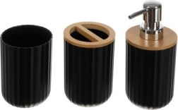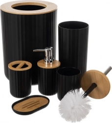 V kompletu najdete vse za čistočo in red: dozirnik za milo s kovinsko pumpico, milnico z bambusnim vložkom za odtekanje vode, kozarec, stojalo za zobne ščetke z bambusnim pokrovom in odprtinami, WC ščetko z ročajem iz nerjavečega jekla ter koš za odpadke s široko okroglo odprtino za enostavno menjavo vrečk.