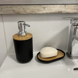 Milnica z bambusnim vložkom ohranja milo suho, dozirnik s kovinsko pumpico pa je idealen za tekoče milo ali gel.