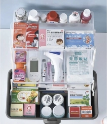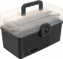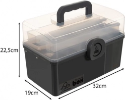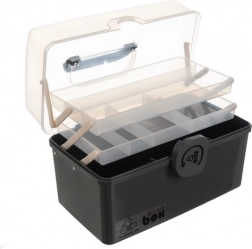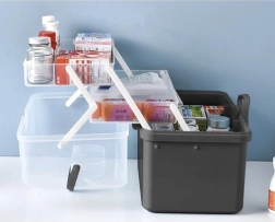 Dvonivojske, zložljive police s predelki so popolne za tablete, mazila, obliže in kozmetiko. Spodnja komora nudi dovolj prostora za večje stekleničke in pakiranja. Lahka konstrukcija in ergonomski ročaj olajšata prenašanje doma in na potovanjih.