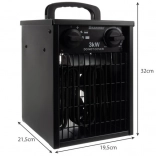Kompaktna električna grelna naprava z močjo 3 kW hitro ogreje delavnico, garažo in domače prostore. Ponuja 3 načine delovanja (hladen, topel, vroč), termostat, zaščito pred pregrevanjem in trdno kovinsko ohišje z zaščito IPX4. Zahvaljujoč priročnemu ročaju in stabilnim nogicam je enostavno prenosna in varna za vsakodnevno uporabo.