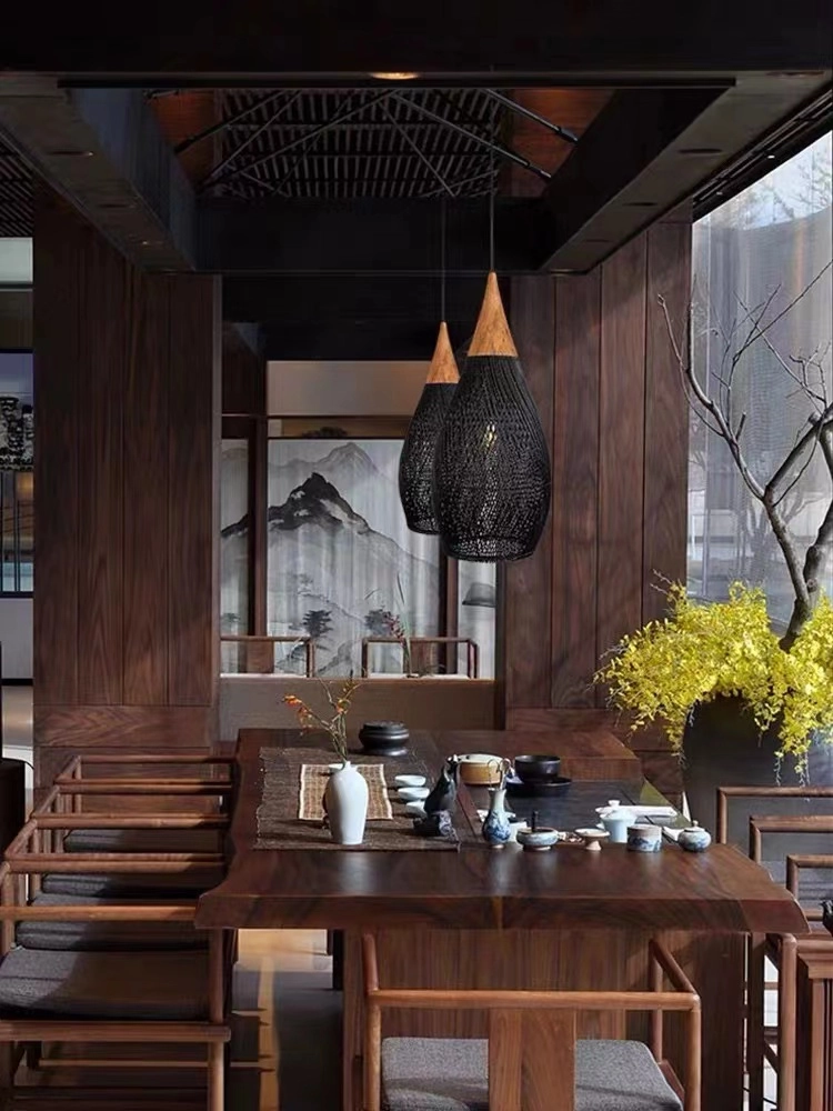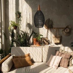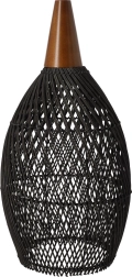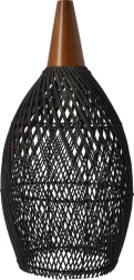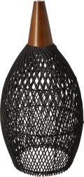 Kombinacija črnega ratana in lesenega poudarka daje svetilki topel, avtentičen in hkrati sodoben izraz, ki se ujema z boho in skandi interierji.