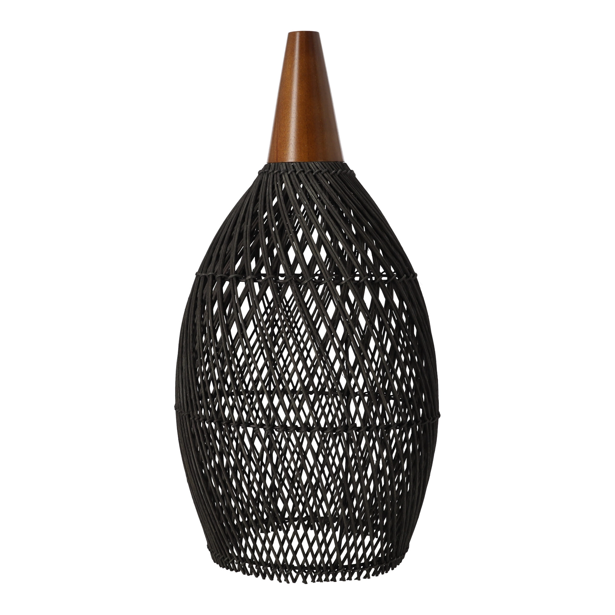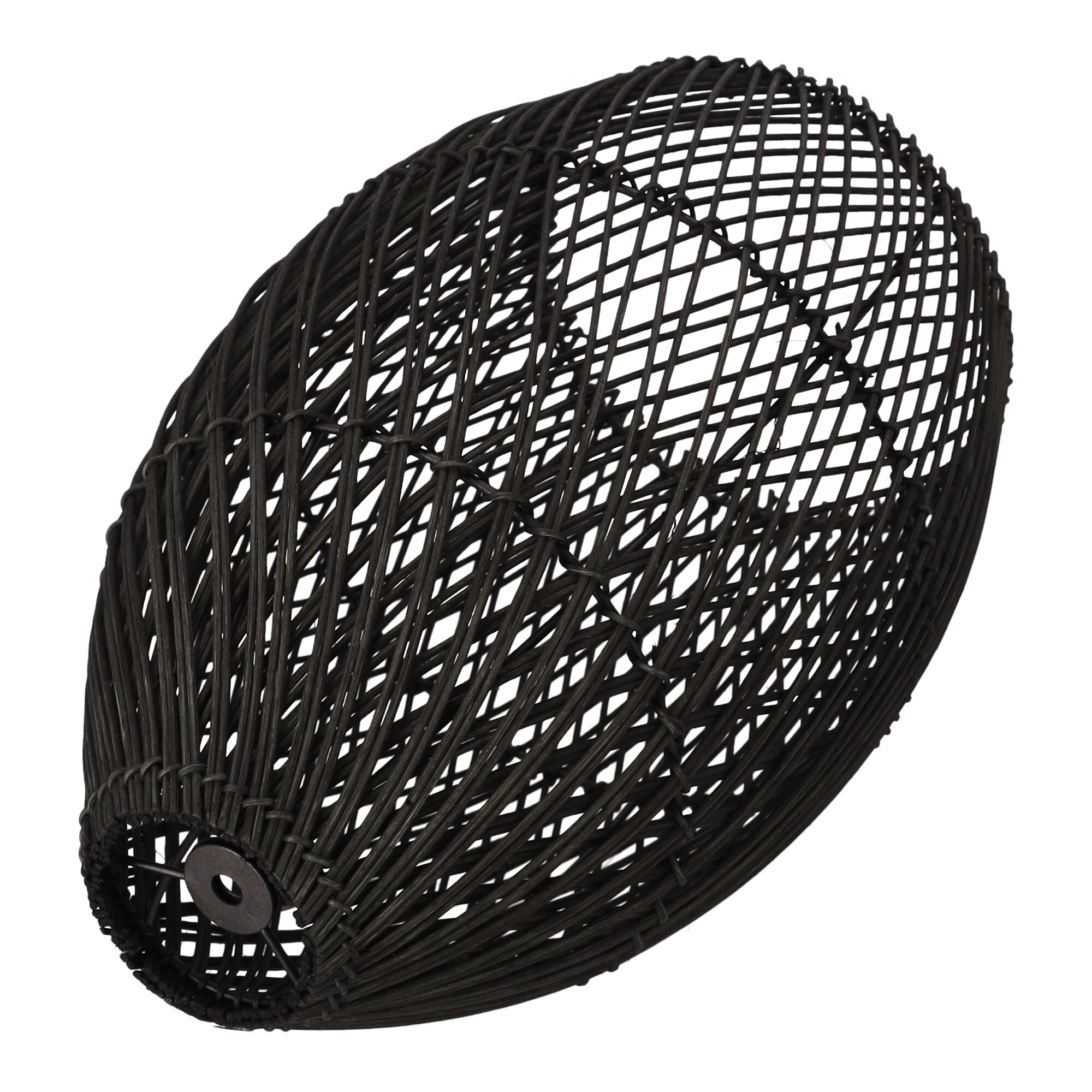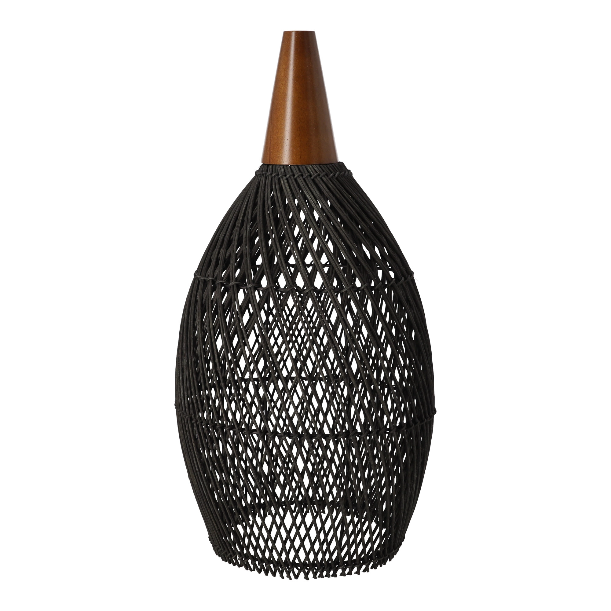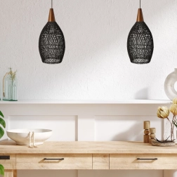 Črna viseča ratanova svetilka z lesenim poudarkom je idealna izbira za jedilnice, dnevne sobe in spalnice. Odprta pletena struktura ustvarja dekorativne sence in prepušča dovolj svetlobe za prijetno atmosfero. Minimalistična oblika in brezčasna kombinacija naravnih materialov se popolno podata boho, skandi in modernim interierjem.