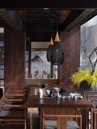 Kombinacija pristne ratanove teksture in lesenih poudarkov v črni izvedbi prostoru doda toplino in eleganco.