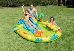 Ta napihljiv bazen z izvirnim dinozavrskim dizajnom prinaša veliko zabave na vrt. Otroci se bodo zabavali s spuščanjem po toboganu in igro z dinozavrskimi figuricami, medtem ko vgrajena pršilna palmica doda še en element vodnega osveženja.
