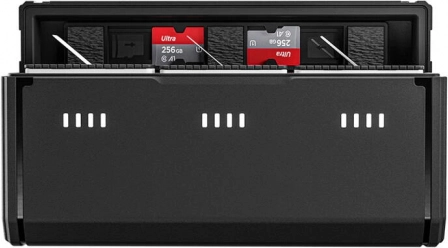 Vgrajeni predelki sprejmejo baterije, dva reža za pomnilniški kartici pa poskrbita za red in zaščito med transportom.