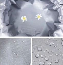 LDPE prevleka zagotavlja popolno vodoodpornost in zaščito pred dežjem, snegom in vlago. Obojestranska srebrno‑siva izvedba za večjo vsestranskost.