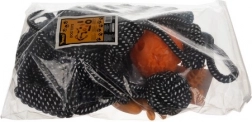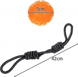 Čvrsta črno-bela vrv in teksturirana oranžna guma preneseta intenzivno uporabo ter pomagata pri čiščenju zob in masaži dlesni med igro.