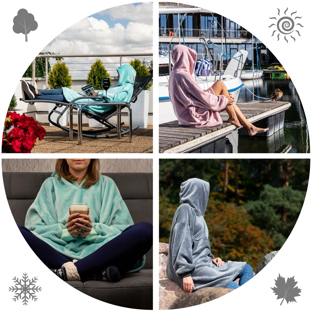 Mehka in topla prevelika hoodica. Bluzair - Hoodie odeja je topla in izjemno mehka kapucarja, ki objame telo kot vaša najljubša odeja. Izdelek 4 v 1: bo udobna mikica, topla odeja, mehak kopalni plašč in prijeten vzglavnik. Neverjetno prijetna na dotik in idealna mikica za ljudi, ki jih hitro zebe. Radi jo boste nosili doma in na prostem. Odlična je tako kot ženska kot tudi moška mikica. Ima eno univerzalno velikost (oversize) - ni vam treba razmišljati, ali je primerna kot darilo!